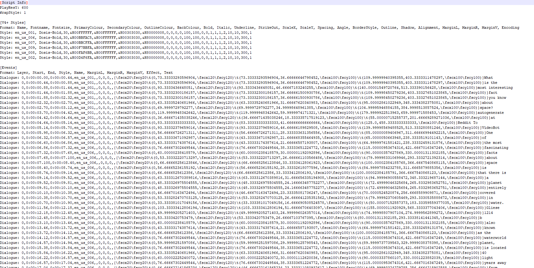 The ASS format consists of a header, where the subtitle styles are defined, followed by a list of subtitle lines. I pre-constructed the header, which will be inserted later.