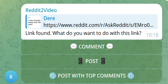 I developed a bot that monitored any links sent in a specific chat. For each link, the bot would prompt the user to choose the type of video they wanted to generate: Comment, Post, or Post with Top Comments. Here’s how each option worked: