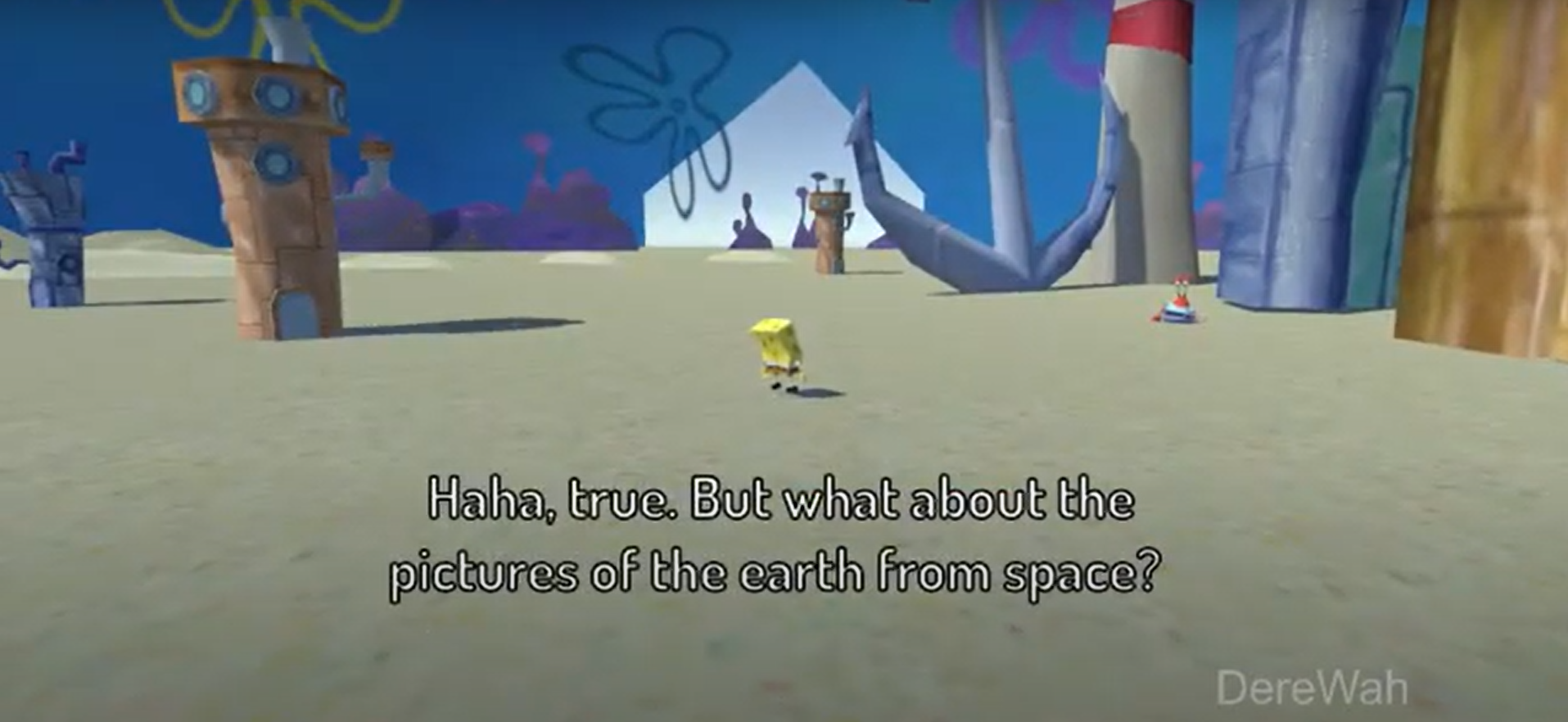 The location was a spot in a simple 3D model of Bikini Bottom, which I pulled from a sketchy Spongebob 3D fan-game site. The transition was a Spongebob-style scene change (e.g., “X hours later…”).