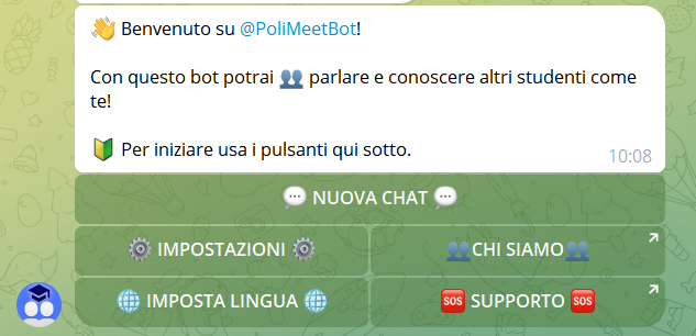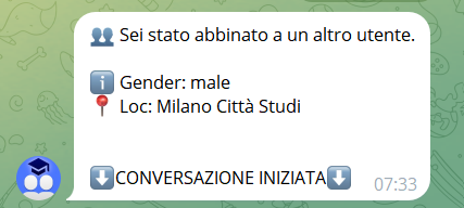 Users could access the bot and specify details like their gender, university campus (we have several across Lombardy), study program, and interests. This info wasn’t used for matching; instead, it gave the matched person a brief bio of who they were talking to.