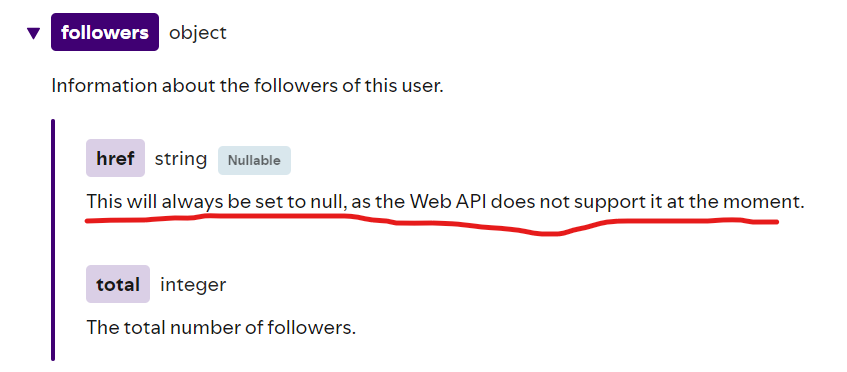 Initially, I was thrilled to find an endpoint in the Spotify API documentation that could query user information. Each user object returned by the API included fields like "followers" and "followings," which, according to the documentation, provided lists of all mutual accounts. However, when I tried to use this endpoint, it displayed a message that it was "not available at the moment."