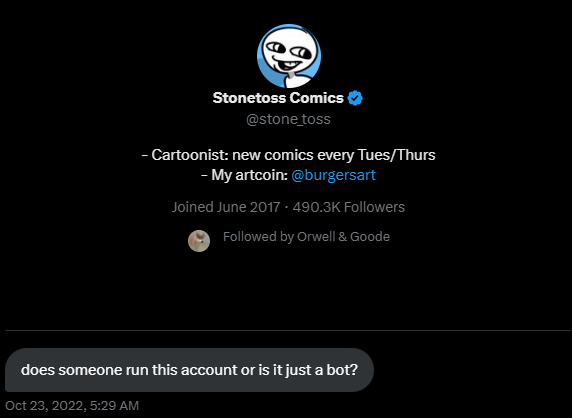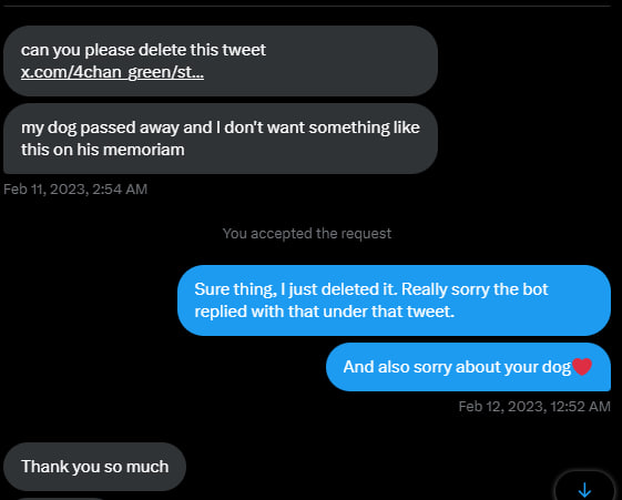 One time, someone posted a memorial for their dog, and a gimmick account I followed interacted with it. The bot replied with a random meme.