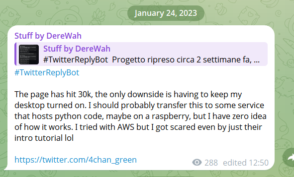 A few months later, I slowly stopped working on the bot. Twitter (now X) introduced stricter limits on the UI API, making stability difficult.