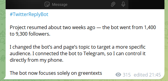 After reaching 1.4k followers, I paused the project. Twitter had started limiting API access, making it hard to maintain the bot.